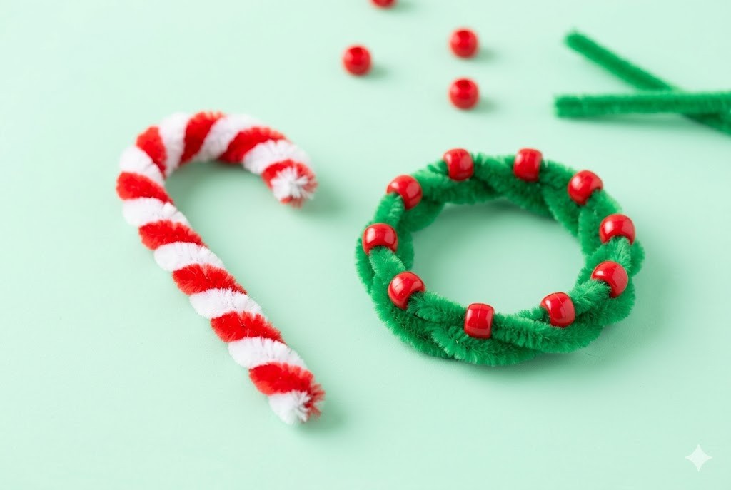| 9 | Beaded Holiday Wreaths | Ages 4-7 | Green pipe cleaners, red pony beads |